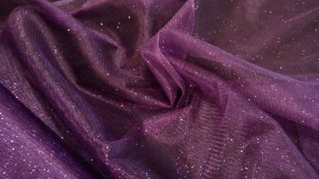 Tyl hrubší s trblietkami, farba: tmavofialová. Materiál: 100 % Nylon. Šírka: 145 centimetrov. Váha: 30 gramov/m². Hrúbka: 0,5 milimetra. Cena je uvedená za 1 meter.