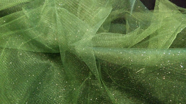 Tyl hrubší s trblietkami, farba: zelená. Materiál: 100 % Nylon. Šírka: 145 centimetrov. Váha: 30 gramov/m². Hrúbka: 0,5 milimetra. Cena je uvedená za 1 meter.