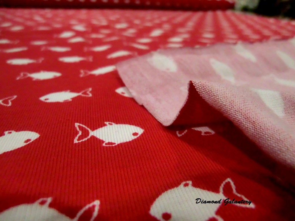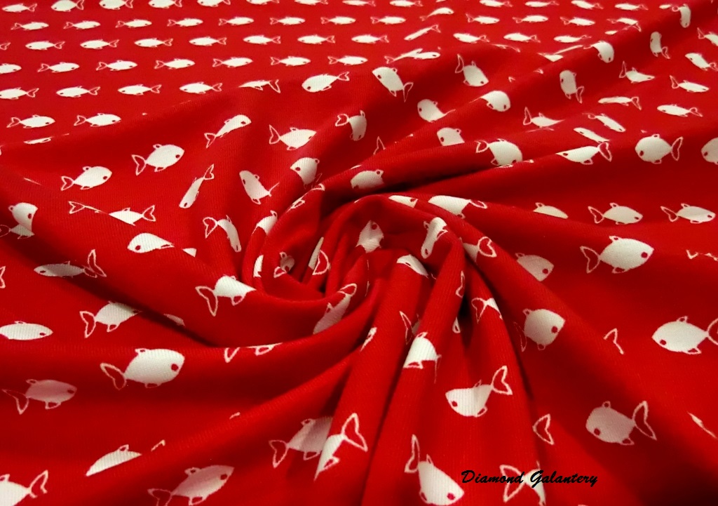 Úplet Rybky, šírka: 150 cm. Odporúčané pranie na 30 stupňov. Látka sa posiela v celku. Materiál: 95 % viskóza, 5 % elastan. Cena je uvedená za 10 cm látky.