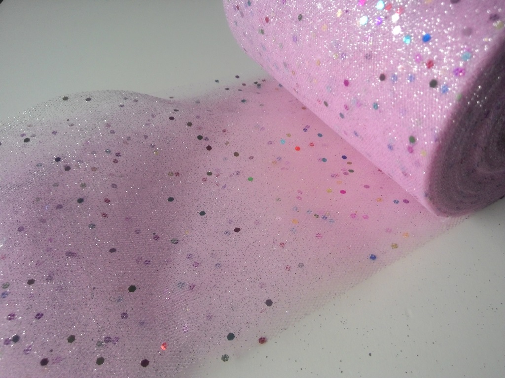 Flitrový tyl o šírke 15 cm, farba: svetloružová. Materiál: 100 % polyester. Cena je uvedená za jeden meter.