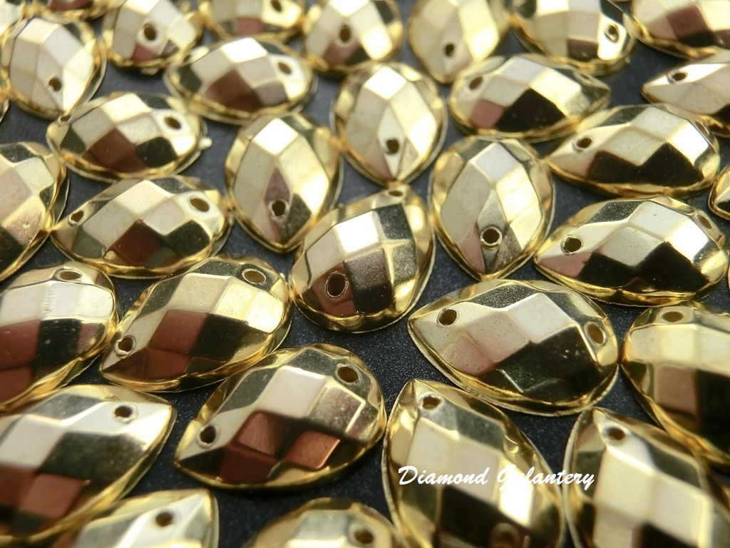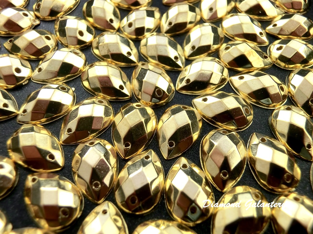 Ozdobné kamienky našívacie, rozmer: 8 x 13 mm, farba: Zlaté. Materiál: akryl. Cena je uvedená za jeden kus.